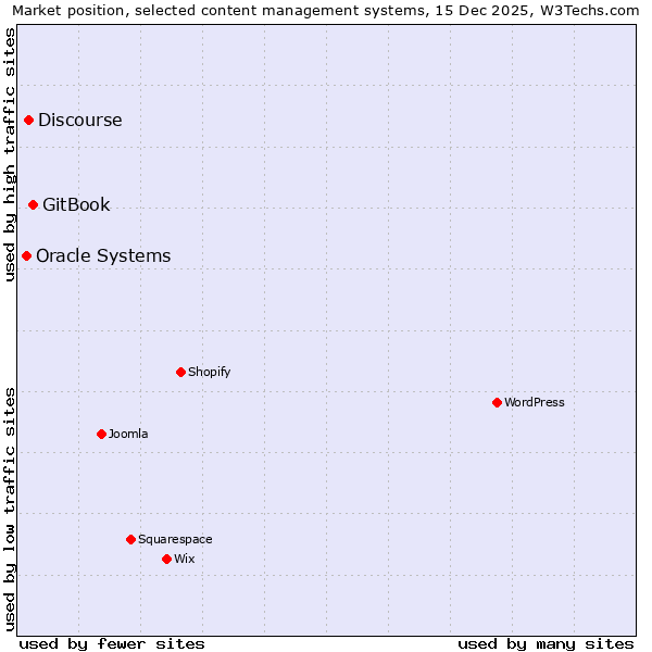 TechnologiesContent ManagementServer-side Languages Client-side Languages JavaScript Libraries CSS Frameworks Web Servers Web Panels Operating Systems Web Hosting Data Centers Reverse Proxies DNS Servers Email Servers SSL Certificate Authorities Content Delivery Traffic Analysis Tools Advertising Networks Tag Managers Social Widgets Site Elements Structured Data Markup Languages Character Encodings Image File Formats Top Level Domains Server Locations Content Languages | Technologies > Content Management > Technology usage comparison Comparison of the usage statistics of GitBook vs. Discourse vs. Oracle Systems for websitesThis report shows the usage statistics of GitBook vs. Discourse vs. Oracle Systems as content management system on the web. See technologies overview for explanations on the methodologies used in the surveys. Our reports are updated daily. Usage and market shareThis diagram shows the percentages of websites using the selected technologies. How to read the diagram: