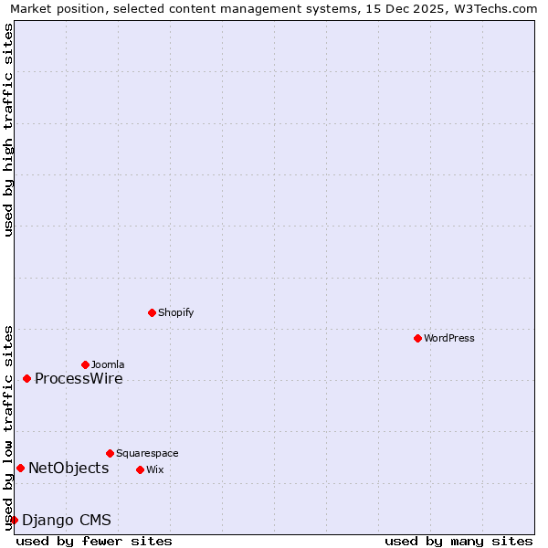 TechnologiesContent ManagementServer-side Languages Client-side Languages JavaScript Libraries CSS Frameworks Web Servers Web Panels Operating Systems Web Hosting Data Centers Reverse Proxies DNS Servers Email Servers SSL Certificate Authorities Content Delivery Traffic Analysis Tools Advertising Networks Tag Managers Social Widgets Site Elements Structured Data Markup Languages Character Encodings Image File Formats Top Level Domains Server Locations Content Languages | Technologies > Content Management > Technology usage comparison Comparison of the usage statistics of ProcessWire vs. NetObjects vs. Django CMS for websitesThis report shows the usage statistics of ProcessWire vs. NetObjects vs. Django CMS as content management system on the web. See technologies overview for explanations on the methodologies used in the surveys. Our reports are updated daily. Usage and market shareThis diagram shows the percentages of websites using the selected technologies. How to read the diagram: