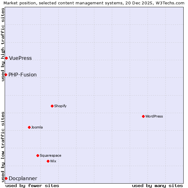 TechnologiesContent ManagementServer-side Languages Client-side Languages JavaScript Libraries CSS Frameworks Web Servers Web Panels Operating Systems Web Hosting Data Centers Reverse Proxies DNS Servers Email Servers SSL Certificate Authorities Content Delivery Traffic Analysis Tools Advertising Networks Tag Managers Social Widgets Site Elements Structured Data Markup Languages Character Encodings Image File Formats Top Level Domains Server Locations Content Languages | Technologies > Content Management > Technology usage comparison Comparison of the usage statistics of VuePress vs. Docplanner vs. PHP-Fusion for websitesThis report shows the usage statistics of VuePress vs. Docplanner vs. PHP-Fusion as content management system on the web. See technologies overview for explanations on the methodologies used in the surveys. Our reports are updated daily. Usage and market shareThis diagram shows the percentages of websites using the selected technologies. How to read the diagram:
