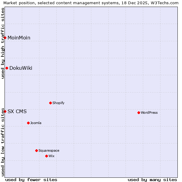 TechnologiesContent ManagementServer-side Languages Client-side Languages JavaScript Libraries CSS Frameworks Web Servers Web Panels Operating Systems Web Hosting Data Centers Reverse Proxies DNS Servers Email Servers SSL Certificate Authorities Content Delivery Traffic Analysis Tools Advertising Networks Tag Managers Social Widgets Site Elements Structured Data Markup Languages Character Encodings Image File Formats Top Level Domains Server Locations Content Languages | Technologies > Content Management > Technology usage comparison Comparison of the usage statistics of DokuWiki vs. MoinMoin vs. SX CMS for websitesThis report shows the usage statistics of DokuWiki vs. MoinMoin vs. SX CMS as content management system on the web. See technologies overview for explanations on the methodologies used in the surveys. Our reports are updated daily. Usage and market shareThis diagram shows the percentages of websites using the selected technologies. How to read the diagram: