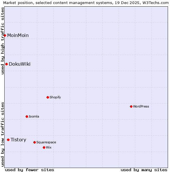 TechnologiesContent ManagementServer-side Languages Client-side Languages JavaScript Libraries CSS Frameworks Web Servers Web Panels Operating Systems Web Hosting Data Centers Reverse Proxies DNS Servers Email Servers SSL Certificate Authorities Content Delivery Traffic Analysis Tools Advertising Networks Tag Managers Social Widgets Site Elements Structured Data Markup Languages Character Encodings Image File Formats Top Level Domains Server Locations Content Languages | Technologies > Content Management > Technology usage comparison Comparison of the usage statistics of Tistory vs. DokuWiki vs. MoinMoin for websitesThis report shows the usage statistics of Tistory vs. DokuWiki vs. MoinMoin as content management system on the web. See technologies overview for explanations on the methodologies used in the surveys. Our reports are updated daily. Usage and market shareThis diagram shows the percentages of websites using the selected technologies. How to read the diagram: