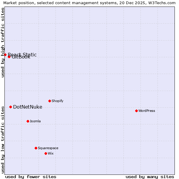 TechnologiesContent ManagementServer-side Languages Client-side Languages JavaScript Libraries CSS Frameworks Web Servers Web Panels Operating Systems Web Hosting Data Centers Reverse Proxies DNS Servers Email Servers SSL Certificate Authorities Content Delivery Traffic Analysis Tools Advertising Networks Tag Managers Social Widgets Site Elements Structured Data Markup Languages Character Encodings Image File Formats Top Level Domains Server Locations Content Languages | Technologies > Content Management > Technology usage comparison Comparison of the usage statistics of DotNetNuke vs. GitBook vs. React Static for websitesThis report shows the usage statistics of DotNetNuke vs. GitBook vs. React Static as content management system on the web. See technologies overview for explanations on the methodologies used in the surveys. Our reports are updated daily. Usage and market shareThis diagram shows the percentages of websites using the selected technologies. How to read the diagram: