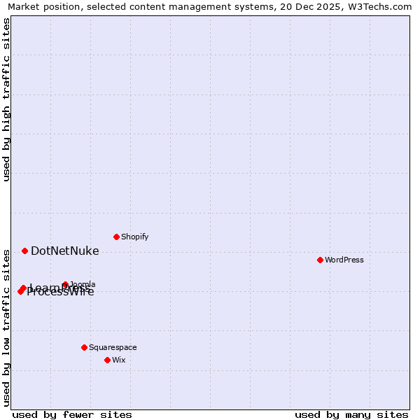 TechnologiesContent ManagementServer-side Languages Client-side Languages JavaScript Libraries CSS Frameworks Web Servers Web Panels Operating Systems Web Hosting Data Centers Reverse Proxies DNS Servers Email Servers SSL Certificate Authorities Content Delivery Traffic Analysis Tools Advertising Networks Tag Managers Social Widgets Site Elements Structured Data Markup Languages Character Encodings Image File Formats Top Level Domains Server Locations Content Languages | Technologies > Content Management > Technology usage comparison Comparison of the usage statistics of DotNetNuke vs. LearnPress vs. ProcessWire for websitesThis report shows the usage statistics of DotNetNuke vs. LearnPress vs. ProcessWire as content management system on the web. See technologies overview for explanations on the methodologies used in the surveys. Our reports are updated daily. Usage and market shareThis diagram shows the percentages of websites using the selected technologies. How to read the diagram:
