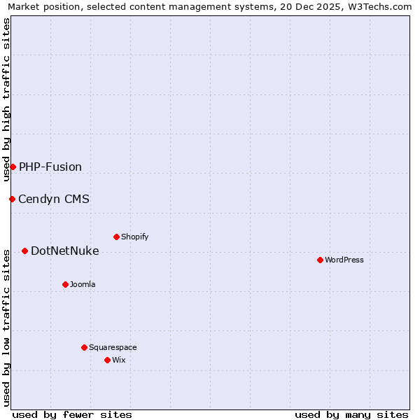 TechnologiesContent ManagementServer-side Languages Client-side Languages JavaScript Libraries CSS Frameworks Web Servers Web Panels Operating Systems Web Hosting Data Centers Reverse Proxies DNS Servers Email Servers SSL Certificate Authorities Content Delivery Traffic Analysis Tools Advertising Networks Tag Managers Social Widgets Site Elements Structured Data Markup Languages Character Encodings Image File Formats Top Level Domains Server Locations Content Languages | Technologies > Content Management > Technology usage comparison Comparison of the usage statistics of DotNetNuke vs. PHP-Fusion vs. Cendyn CMS for websitesThis report shows the usage statistics of DotNetNuke vs. PHP-Fusion vs. Cendyn CMS as content management system on the web. See technologies overview for explanations on the methodologies used in the surveys. Our reports are updated daily. Usage and market shareThis diagram shows the percentages of websites using the selected technologies. How to read the diagram: