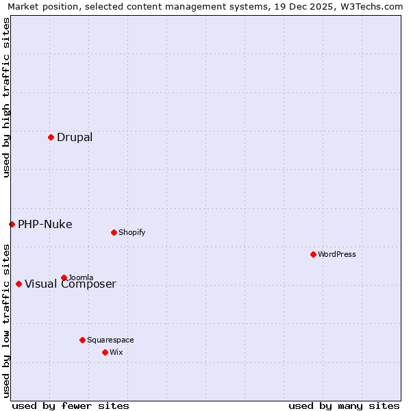 TechnologiesContent ManagementServer-side Languages Client-side Languages JavaScript Libraries CSS Frameworks Web Servers Web Panels Operating Systems Web Hosting Data Centers Reverse Proxies DNS Servers Email Servers SSL Certificate Authorities Content Delivery Traffic Analysis Tools Advertising Networks Tag Managers Social Widgets Site Elements Structured Data Markup Languages Character Encodings Image File Formats Top Level Domains Server Locations Content Languages | Technologies > Content Management > Technology usage comparison Comparison of the usage statistics of Drupal vs. Visual Composer vs. PHP-Nuke for websitesThis report shows the usage statistics of Drupal vs. Visual Composer vs. PHP-Nuke as content management system on the web. See technologies overview for explanations on the methodologies used in the surveys. Our reports are updated daily. Usage and market shareThis diagram shows the percentages of websites using the selected technologies. How to read the diagram:
