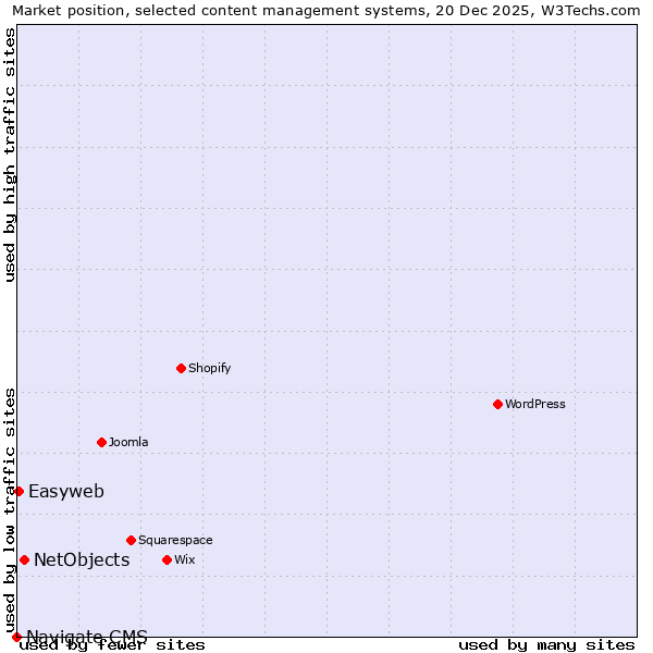 TechnologiesContent ManagementServer-side Languages Client-side Languages JavaScript Libraries CSS Frameworks Web Servers Web Panels Operating Systems Web Hosting Data Centers Reverse Proxies DNS Servers Email Servers SSL Certificate Authorities Content Delivery Traffic Analysis Tools Advertising Networks Tag Managers Social Widgets Site Elements Structured Data Markup Languages Character Encodings Image File Formats Top Level Domains Server Locations Content Languages | Technologies > Content Management > Technology usage comparison Comparison of the usage statistics of NetObjects vs. Easyweb vs. Navigate CMS for websitesThis report shows the usage statistics of NetObjects vs. Easyweb vs. Navigate CMS as content management system on the web. See technologies overview for explanations on the methodologies used in the surveys. Our reports are updated daily. Usage and market shareThis diagram shows the percentages of websites using the selected technologies. How to read the diagram: