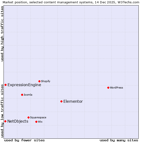 TechnologiesContent ManagementServer-side Languages Client-side Languages JavaScript Libraries CSS Frameworks Web Servers Web Panels Operating Systems Web Hosting Data Centers Reverse Proxies DNS Servers Email Servers SSL Certificate Authorities Content Delivery Traffic Analysis Tools Advertising Networks Tag Managers Social Widgets Site Elements Structured Data Markup Languages Character Encodings Image File Formats Top Level Domains Server Locations Content Languages | Technologies > Content Management > Technology usage comparison Comparison of the usage statistics of Elementor vs. ExpressionEngine vs. NetObjects for websitesThis report shows the usage statistics of Elementor vs. ExpressionEngine vs. NetObjects as content management system on the web. See technologies overview for explanations on the methodologies used in the surveys. Our reports are updated daily. Usage and market shareThis diagram shows the percentages of websites using the selected technologies. How to read the diagram: