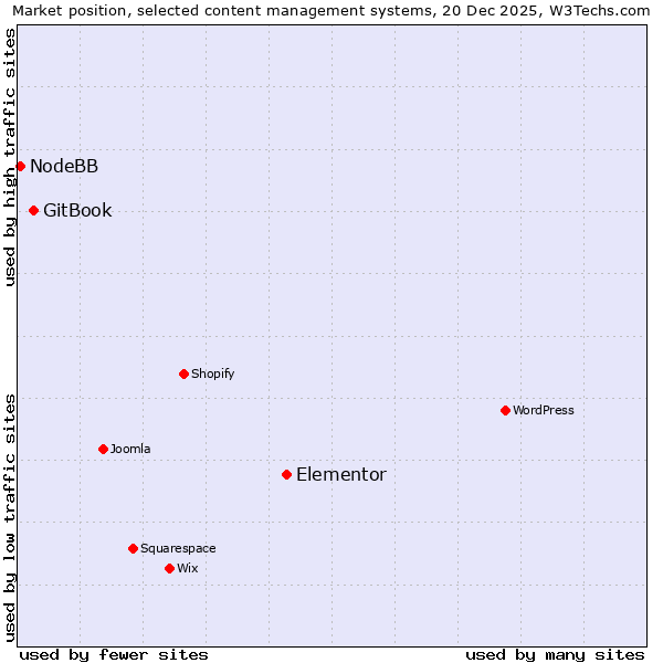 TechnologiesContent ManagementServer-side Languages Client-side Languages JavaScript Libraries CSS Frameworks Web Servers Web Panels Operating Systems Web Hosting Data Centers Reverse Proxies DNS Servers Email Servers SSL Certificate Authorities Content Delivery Traffic Analysis Tools Advertising Networks Tag Managers Social Widgets Site Elements Structured Data Markup Languages Character Encodings Image File Formats Top Level Domains Server Locations Content Languages | Technologies > Content Management > Technology usage comparison Comparison of the usage statistics of Elementor vs. GitBook vs. NodeBB for websitesThis report shows the usage statistics of Elementor vs. GitBook vs. NodeBB as content management system on the web. See technologies overview for explanations on the methodologies used in the surveys. Our reports are updated daily. Usage and market shareThis diagram shows the percentages of websites using the selected technologies. How to read the diagram: