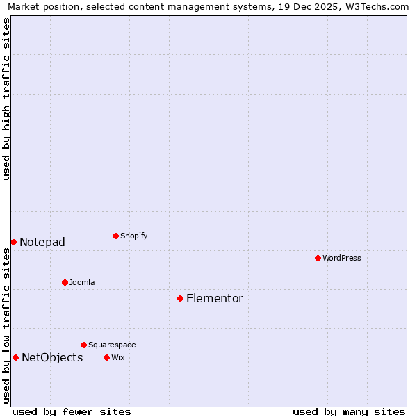 TechnologiesContent ManagementServer-side Languages Client-side Languages JavaScript Libraries CSS Frameworks Web Servers Web Panels Operating Systems Web Hosting Data Centers Reverse Proxies DNS Servers Email Servers SSL Certificate Authorities Content Delivery Traffic Analysis Tools Advertising Networks Tag Managers Social Widgets Site Elements Structured Data Markup Languages Character Encodings Image File Formats Top Level Domains Server Locations Content Languages | Technologies > Content Management > Technology usage comparison Comparison of the usage statistics of Elementor vs. NetObjects vs. Notepad for websitesThis report shows the usage statistics of Elementor vs. NetObjects vs. Notepad as content management system on the web. See technologies overview for explanations on the methodologies used in the surveys. Our reports are updated daily. Usage and market shareThis diagram shows the percentages of websites using the selected technologies. How to read the diagram: