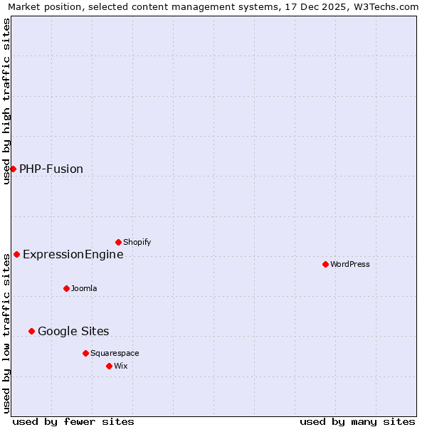 TechnologiesContent ManagementServer-side Languages Client-side Languages JavaScript Libraries CSS Frameworks Web Servers Web Panels Operating Systems Web Hosting Data Centers Reverse Proxies DNS Servers Email Servers SSL Certificate Authorities Content Delivery Traffic Analysis Tools Advertising Networks Tag Managers Social Widgets Site Elements Structured Data Markup Languages Character Encodings Image File Formats Top Level Domains Server Locations Content Languages | Technologies > Content Management > Technology usage comparison Comparison of the usage statistics of Google Sites vs. ExpressionEngine vs. PHP-Fusion for websitesThis report shows the usage statistics of Google Sites vs. ExpressionEngine vs. PHP-Fusion as content management system on the web. See technologies overview for explanations on the methodologies used in the surveys. Our reports are updated daily. Usage and market shareThis diagram shows the percentages of websites using the selected technologies. How to read the diagram: