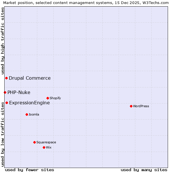 TechnologiesContent ManagementServer-side Languages Client-side Languages JavaScript Libraries CSS Frameworks Web Servers Web Panels Operating Systems Web Hosting Data Centers Reverse Proxies DNS Servers Email Servers SSL Certificate Authorities Content Delivery Traffic Analysis Tools Advertising Networks Tag Managers Social Widgets Site Elements Structured Data Markup Languages Character Encodings Image File Formats Top Level Domains Server Locations Content Languages | Technologies > Content Management > Technology usage comparison Comparison of the usage statistics of ExpressionEngine vs. Drupal Commerce vs. PHP-Nuke for websitesThis report shows the usage statistics of ExpressionEngine vs. Drupal Commerce vs. PHP-Nuke as content management system on the web. See technologies overview for explanations on the methodologies used in the surveys. Our reports are updated daily. Usage and market shareThis diagram shows the percentages of websites using the selected technologies. How to read the diagram: