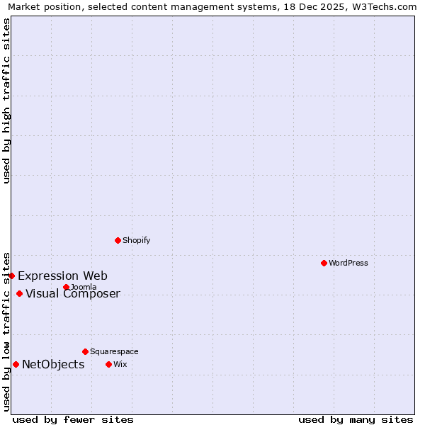 TechnologiesContent ManagementServer-side Languages Client-side Languages JavaScript Libraries CSS Frameworks Web Servers Web Panels Operating Systems Web Hosting Data Centers Reverse Proxies DNS Servers Email Servers SSL Certificate Authorities Content Delivery Traffic Analysis Tools Advertising Networks Tag Managers Social Widgets Site Elements Structured Data Markup Languages Character Encodings Image File Formats Top Level Domains Server Locations Content Languages | Technologies > Content Management > Technology usage comparison Comparison of the usage statistics of Visual Composer vs. NetObjects vs. Expression Web for websitesThis report shows the usage statistics of Visual Composer vs. NetObjects vs. Expression Web as content management system on the web. See technologies overview for explanations on the methodologies used in the surveys. Our reports are updated daily. Usage and market shareThis diagram shows the percentages of websites using the selected technologies. How to read the diagram: