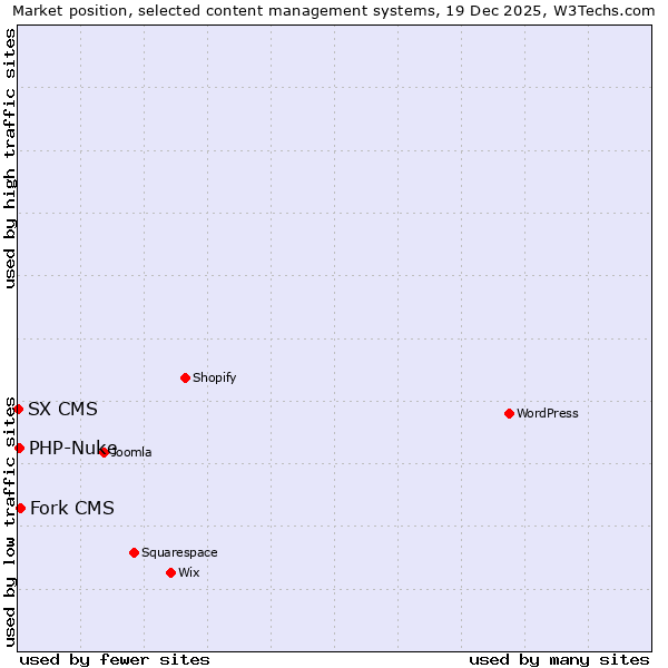 TechnologiesContent ManagementServer-side Languages Client-side Languages JavaScript Libraries CSS Frameworks Web Servers Web Panels Operating Systems Web Hosting Data Centers Reverse Proxies DNS Servers Email Servers SSL Certificate Authorities Content Delivery Traffic Analysis Tools Advertising Networks Tag Managers Social Widgets Site Elements Structured Data Markup Languages Character Encodings Image File Formats Top Level Domains Server Locations Content Languages | Technologies > Content Management > Technology usage comparison Comparison of the usage statistics of Fork CMS vs. PHP-Nuke vs. SX CMS for websitesThis report shows the usage statistics of Fork CMS vs. PHP-Nuke vs. SX CMS as content management system on the web. See technologies overview for explanations on the methodologies used in the surveys. Our reports are updated daily. Usage and market shareThis diagram shows the percentages of websites using the selected technologies. How to read the diagram: