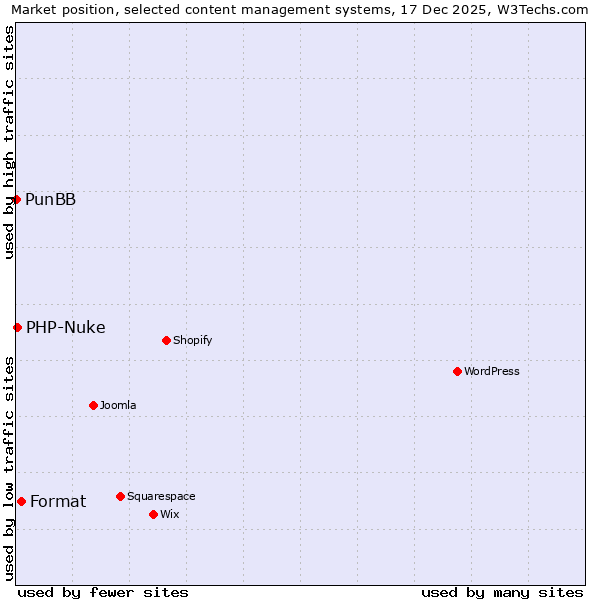TechnologiesContent ManagementServer-side Languages Client-side Languages JavaScript Libraries CSS Frameworks Web Servers Web Panels Operating Systems Web Hosting Data Centers Reverse Proxies DNS Servers Email Servers SSL Certificate Authorities Content Delivery Traffic Analysis Tools Advertising Networks Tag Managers Social Widgets Site Elements Structured Data Markup Languages Character Encodings Image File Formats Top Level Domains Server Locations Content Languages | Technologies > Content Management > Technology usage comparison Comparison of the usage statistics of Format vs. PHP-Nuke vs. PunBB for websitesThis report shows the usage statistics of Format vs. PHP-Nuke vs. PunBB as content management system on the web. See technologies overview for explanations on the methodologies used in the surveys. Our reports are updated daily. Usage and market shareThis diagram shows the percentages of websites using the selected technologies. How to read the diagram:
