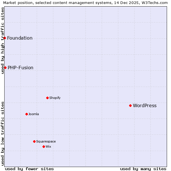 TechnologiesContent ManagementServer-side Languages Client-side Languages JavaScript Libraries CSS Frameworks Web Servers Web Panels Operating Systems Web Hosting Data Centers Reverse Proxies DNS Servers Email Servers SSL Certificate Authorities Content Delivery Traffic Analysis Tools Advertising Networks Tag Managers Social Widgets Site Elements Structured Data Markup Languages Character Encodings Image File Formats Top Level Domains Server Locations Content Languages | Technologies > Content Management > Technology usage comparison Comparison of the usage statistics of WordPress vs. PHP-Fusion vs. Foundation for websitesThis report shows the usage statistics of WordPress vs. PHP-Fusion vs. Foundation as content management system on the web. See technologies overview for explanations on the methodologies used in the surveys. Our reports are updated daily. Usage and market shareThis diagram shows the percentages of websites using the selected technologies. How to read the diagram: