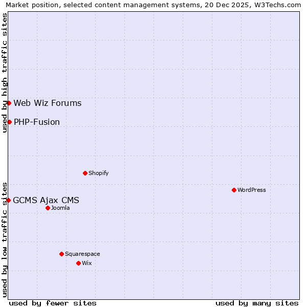 TechnologiesContent ManagementServer-side Languages Client-side Languages JavaScript Libraries CSS Frameworks Web Servers Web Panels Operating Systems Web Hosting Data Centers Reverse Proxies DNS Servers Email Servers SSL Certificate Authorities Content Delivery Traffic Analysis Tools Advertising Networks Tag Managers Social Widgets Site Elements Structured Data Markup Languages Character Encodings Image File Formats Top Level Domains Server Locations Content Languages | Technologies > Content Management > Technology usage comparison Comparison of the usage statistics of PHP-Fusion vs. Web Wiz Forums vs. GCMS Ajax CMS for websitesThis report shows the usage statistics of PHP-Fusion vs. Web Wiz Forums vs. GCMS Ajax CMS as content management system on the web. See technologies overview for explanations on the methodologies used in the surveys. Our reports are updated daily. Usage and market shareThis diagram shows the percentages of websites using the selected technologies. How to read the diagram: