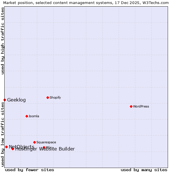 TechnologiesContent ManagementServer-side Languages Client-side Languages JavaScript Libraries CSS Frameworks Web Servers Web Panels Operating Systems Web Hosting Data Centers Reverse Proxies DNS Servers Email Servers SSL Certificate Authorities Content Delivery Traffic Analysis Tools Advertising Networks Tag Managers Social Widgets Site Elements Structured Data Markup Languages Character Encodings Image File Formats Top Level Domains Server Locations Content Languages | Technologies > Content Management > Technology usage comparison Comparison of the usage statistics of Hostinger Website Builder vs. NetObjects vs. Geeklog for websitesThis report shows the usage statistics of Hostinger Website Builder vs. NetObjects vs. Geeklog as content management system on the web. See technologies overview for explanations on the methodologies used in the surveys. Our reports are updated daily. Usage and market shareThis diagram shows the percentages of websites using the selected technologies. How to read the diagram:
