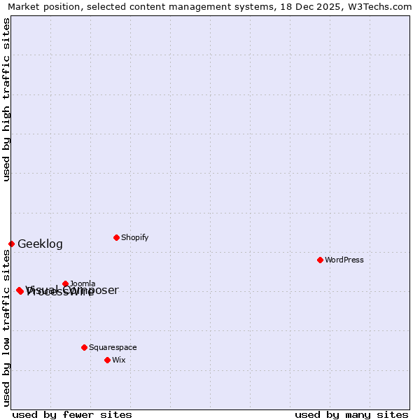 TechnologiesContent ManagementServer-side Languages Client-side Languages JavaScript Libraries CSS Frameworks Web Servers Web Panels Operating Systems Web Hosting Data Centers Reverse Proxies DNS Servers Email Servers SSL Certificate Authorities Content Delivery Traffic Analysis Tools Advertising Networks Tag Managers Social Widgets Site Elements Structured Data Markup Languages Character Encodings Image File Formats Top Level Domains Server Locations Content Languages | Technologies > Content Management > Technology usage comparison Comparison of the usage statistics of ProcessWire vs. Visual Composer vs. Geeklog for websitesThis report shows the usage statistics of ProcessWire vs. Visual Composer vs. Geeklog as content management system on the web. See technologies overview for explanations on the methodologies used in the surveys. Our reports are updated daily. Usage and market shareThis diagram shows the percentages of websites using the selected technologies. How to read the diagram: