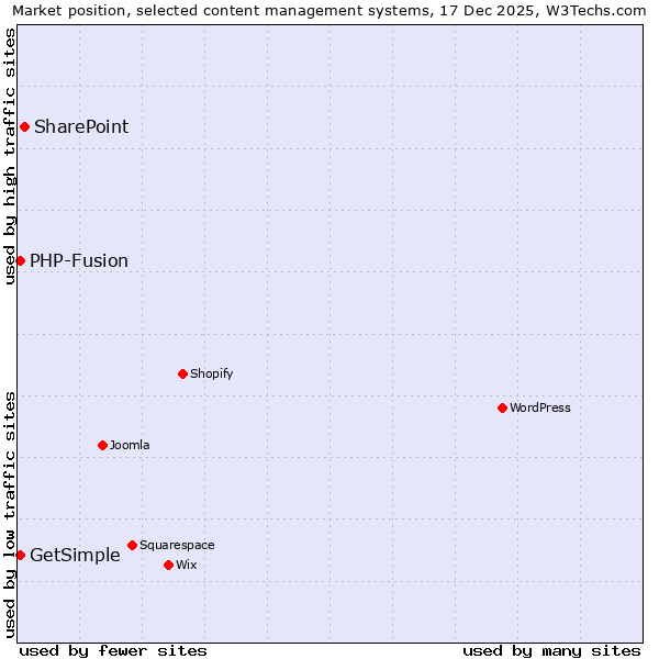 TechnologiesContent ManagementServer-side Languages Client-side Languages JavaScript Libraries CSS Frameworks Web Servers Web Panels Operating Systems Web Hosting Data Centers Reverse Proxies DNS Servers Email Servers SSL Certificate Authorities Content Delivery Traffic Analysis Tools Advertising Networks Tag Managers Social Widgets Site Elements Structured Data Markup Languages Character Encodings Image File Formats Top Level Domains Server Locations Content Languages | Technologies > Content Management > Technology usage comparison Comparison of the usage statistics of SharePoint vs. PHP-Fusion vs. GetSimple for websitesThis report shows the usage statistics of SharePoint vs. PHP-Fusion vs. GetSimple as content management system on the web. See technologies overview for explanations on the methodologies used in the surveys. Our reports are updated daily. Usage and market shareThis diagram shows the percentages of websites using the selected technologies. How to read the diagram: