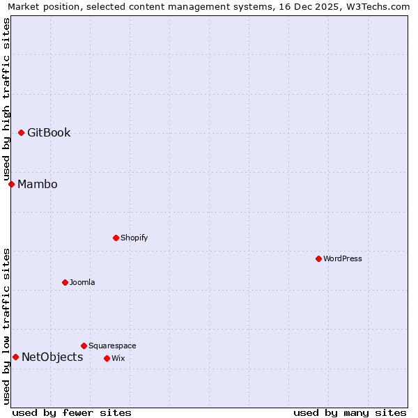 TechnologiesContent ManagementServer-side Languages Client-side Languages JavaScript Libraries CSS Frameworks Web Servers Web Panels Operating Systems Web Hosting Data Centers Reverse Proxies DNS Servers Email Servers SSL Certificate Authorities Content Delivery Traffic Analysis Tools Advertising Networks Tag Managers Social Widgets Site Elements Structured Data Markup Languages Character Encodings Image File Formats Top Level Domains Server Locations Content Languages | Technologies > Content Management > Technology usage comparison Comparison of the usage statistics of GitBook vs. NetObjects vs. Mambo for websitesThis report shows the usage statistics of GitBook vs. NetObjects vs. Mambo as content management system on the web. See technologies overview for explanations on the methodologies used in the surveys. Our reports are updated daily. Usage and market shareThis diagram shows the percentages of websites using the selected technologies. How to read the diagram: