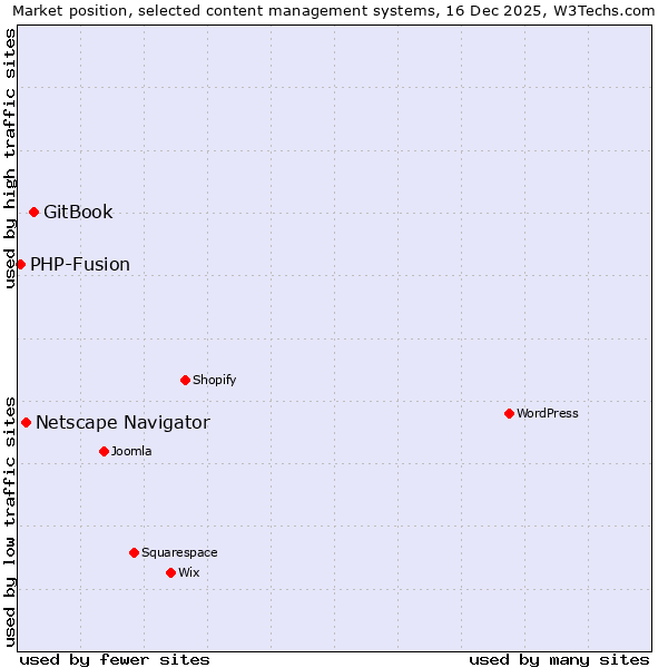 TechnologiesContent ManagementServer-side Languages Client-side Languages JavaScript Libraries CSS Frameworks Web Servers Web Panels Operating Systems Web Hosting Data Centers Reverse Proxies DNS Servers Email Servers SSL Certificate Authorities Content Delivery Traffic Analysis Tools Advertising Networks Tag Managers Social Widgets Site Elements Structured Data Markup Languages Character Encodings Image File Formats Top Level Domains Server Locations Content Languages | Technologies > Content Management > Technology usage comparison Comparison of the usage statistics of GitBook vs. Netscape Navigator vs. PHP-Fusion for websitesThis report shows the usage statistics of GitBook vs. Netscape Navigator vs. PHP-Fusion as content management system on the web. See technologies overview for explanations on the methodologies used in the surveys. Our reports are updated daily. Usage and market shareThis diagram shows the percentages of websites using the selected technologies. How to read the diagram: