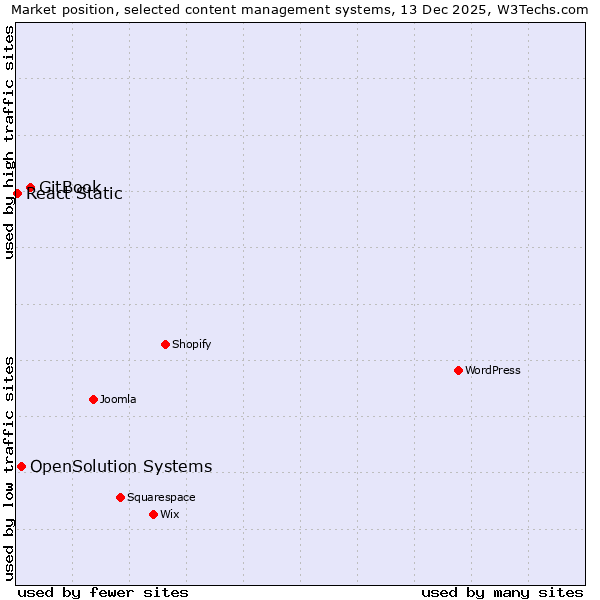 TechnologiesContent ManagementServer-side Languages Client-side Languages JavaScript Libraries CSS Frameworks Web Servers Web Panels Operating Systems Web Hosting Data Centers Reverse Proxies DNS Servers Email Servers SSL Certificate Authorities Content Delivery Traffic Analysis Tools Advertising Networks Tag Managers Social Widgets Site Elements Structured Data Markup Languages Character Encodings Image File Formats Top Level Domains Server Locations Content Languages | Technologies > Content Management > Technology usage comparison Comparison of the usage statistics of GitBook vs. OpenSolution Systems vs. React Static for websitesThis report shows the usage statistics of GitBook vs. OpenSolution Systems vs. React Static as content management system on the web. See technologies overview for explanations on the methodologies used in the surveys. Our reports are updated daily. Usage and market shareThis diagram shows the percentages of websites using the selected technologies. How to read the diagram: