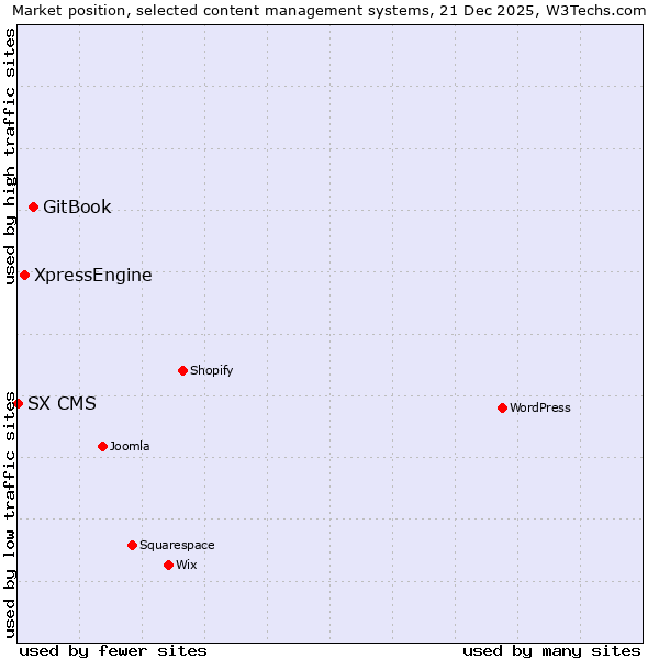 TechnologiesContent ManagementServer-side Languages Client-side Languages JavaScript Libraries CSS Frameworks Web Servers Web Panels Operating Systems Web Hosting Data Centers Reverse Proxies DNS Servers Email Servers SSL Certificate Authorities Content Delivery Traffic Analysis Tools Advertising Networks Tag Managers Social Widgets Site Elements Structured Data Markup Languages Character Encodings Image File Formats Top Level Domains Server Locations Content Languages | Technologies > Content Management > Technology usage comparison Comparison of the usage statistics of GitBook vs. XpressEngine vs. SX CMS for websitesThis report shows the usage statistics of GitBook vs. XpressEngine vs. SX CMS as content management system on the web. See technologies overview for explanations on the methodologies used in the surveys. Our reports are updated daily. Usage and market shareThis diagram shows the percentages of websites using the selected technologies. How to read the diagram: