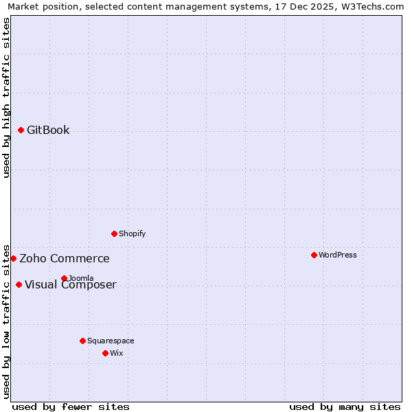 TechnologiesContent ManagementServer-side Languages Client-side Languages JavaScript Libraries CSS Frameworks Web Servers Web Panels Operating Systems Web Hosting Data Centers Reverse Proxies DNS Servers Email Servers SSL Certificate Authorities Content Delivery Traffic Analysis Tools Advertising Networks Tag Managers Social Widgets Site Elements Structured Data Markup Languages Character Encodings Image File Formats Top Level Domains Server Locations Content Languages | Technologies > Content Management > Technology usage comparison Comparison of the usage statistics of GitBook vs. Visual Composer vs. Zoho Commerce for websitesThis report shows the usage statistics of GitBook vs. Visual Composer vs. Zoho Commerce as content management system on the web. See technologies overview for explanations on the methodologies used in the surveys. Our reports are updated daily. Usage and market shareThis diagram shows the percentages of websites using the selected technologies. How to read the diagram: