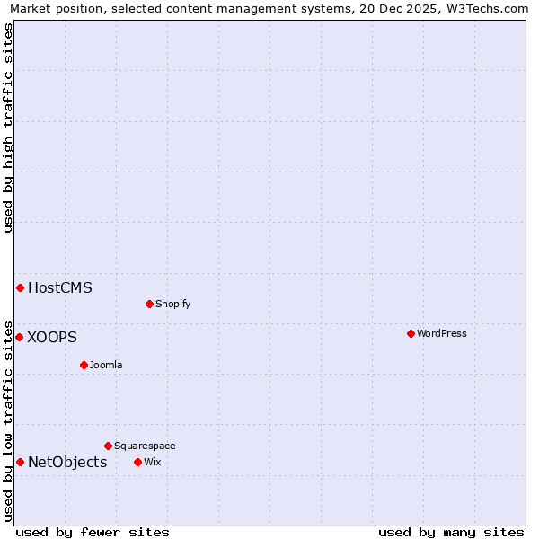 TechnologiesContent ManagementServer-side Languages Client-side Languages JavaScript Libraries CSS Frameworks Web Servers Web Panels Operating Systems Web Hosting Data Centers Reverse Proxies DNS Servers Email Servers SSL Certificate Authorities Content Delivery Traffic Analysis Tools Advertising Networks Tag Managers Social Widgets Site Elements Structured Data Markup Languages Character Encodings Image File Formats Top Level Domains Server Locations Content Languages | Technologies > Content Management > Technology usage comparison Comparison of the usage statistics of NetObjects vs. HostCMS vs. XOOPS for websitesThis report shows the usage statistics of NetObjects vs. HostCMS vs. XOOPS as content management system on the web. See technologies overview for explanations on the methodologies used in the surveys. Our reports are updated daily. Usage and market shareThis diagram shows the percentages of websites using the selected technologies. How to read the diagram: