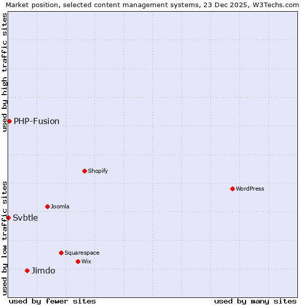 TechnologiesContent ManagementServer-side Languages Client-side Languages JavaScript Libraries CSS Frameworks Web Servers Web Panels Operating Systems Web Hosting Data Centers Reverse Proxies DNS Servers Email Servers SSL Certificate Authorities Content Delivery Traffic Analysis Tools Advertising Networks Tag Managers Social Widgets Site Elements Structured Data Markup Languages Character Encodings Image File Formats Top Level Domains Server Locations Content Languages | Technologies > Content Management > Technology usage comparison Comparison of the usage statistics of Jimdo vs. PHP-Fusion vs. Svbtle for websitesThis report shows the usage statistics of Jimdo vs. PHP-Fusion vs. Svbtle as content management system on the web. See technologies overview for explanations on the methodologies used in the surveys. Our reports are updated daily. Usage and market shareThis diagram shows the percentages of websites using the selected technologies. How to read the diagram:
