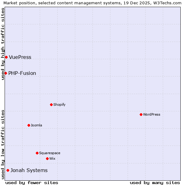 TechnologiesContent ManagementServer-side Languages Client-side Languages JavaScript Libraries CSS Frameworks Web Servers Web Panels Operating Systems Web Hosting Data Centers Reverse Proxies DNS Servers Email Servers SSL Certificate Authorities Content Delivery Traffic Analysis Tools Advertising Networks Tag Managers Social Widgets Site Elements Structured Data Markup Languages Character Encodings Image File Formats Top Level Domains Server Locations Content Languages | Technologies > Content Management > Technology usage comparison Comparison of the usage statistics of Jonah Systems vs. VuePress vs. PHP-Fusion for websitesThis report shows the usage statistics of Jonah Systems vs. VuePress vs. PHP-Fusion as content management system on the web. See technologies overview for explanations on the methodologies used in the surveys. Our reports are updated daily. Usage and market shareThis diagram shows the percentages of websites using the selected technologies. How to read the diagram: