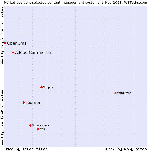 TechnologiesContent ManagementServer-side Languages Client-side Languages JavaScript Libraries CSS Frameworks Web Servers Web Panels Operating Systems Web Hosting Data Centers Reverse Proxies DNS Servers Email Servers SSL Certificate Authorities Content Delivery Traffic Analysis Tools Advertising Networks Tag Managers Social Widgets Site Elements Structured Data Markup Languages Character Encodings Image File Formats Top Level Domains Server Locations Content Languages | Technologies > Content Management > Technology usage comparison Comparison of the usage statistics of Joomla vs. Adobe Commerce vs. OpenCms for websitesThis report shows the usage statistics of Joomla vs. Adobe Commerce vs. OpenCms as content management system on the web. See technologies overview for explanations on the methodologies used in the surveys. Our reports are updated daily. Usage and market shareThis diagram shows the percentages of websites using the selected technologies. How to read the diagram: