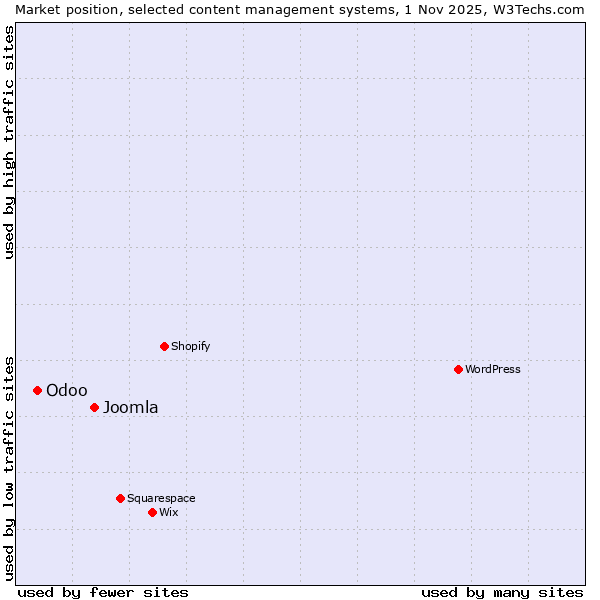 TechnologiesContent ManagementServer-side Languages Client-side Languages JavaScript Libraries CSS Frameworks Web Servers Web Panels Operating Systems Web Hosting Data Centers Reverse Proxies DNS Servers Email Servers SSL Certificate Authorities Content Delivery Traffic Analysis Tools Advertising Networks Tag Managers Social Widgets Site Elements Structured Data Markup Languages Character Encodings Image File Formats Top Level Domains Server Locations Content Languages ComparisonCompare with other | Technologies > Content Management > Technology usage comparison Comparison of the usage statistics of Joomla vs. Odoo for websitesThis report shows the usage statistics of Joomla vs. Odoo as content management system on the web. See technologies overview for explanations on the methodologies used in the surveys. Our reports are updated daily. Usage and market shareThis diagram shows the percentages of websites using the selected technologies. How to read the diagram: