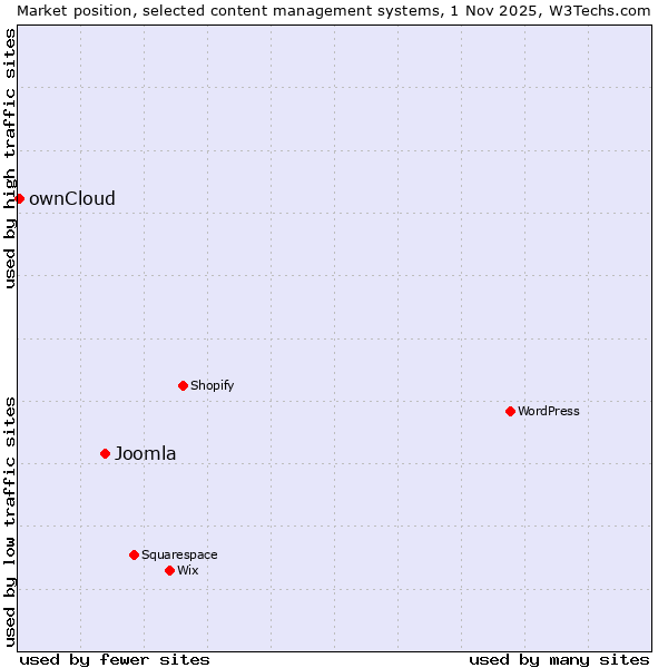 TechnologiesContent ManagementServer-side Languages Client-side Languages JavaScript Libraries CSS Frameworks Web Servers Web Panels Operating Systems Web Hosting Data Centers Reverse Proxies DNS Servers Email Servers SSL Certificate Authorities Content Delivery Traffic Analysis Tools Advertising Networks Tag Managers Social Widgets Site Elements Structured Data Markup Languages Character Encodings Image File Formats Top Level Domains Server Locations Content Languages ComparisonCompare with other | Technologies > Content Management > Technology usage comparison Comparison of the usage statistics of Joomla vs. ownCloud for websitesThis report shows the usage statistics of Joomla vs. ownCloud as content management system on the web. See technologies overview for explanations on the methodologies used in the surveys. Our reports are updated daily. Usage and market shareThis diagram shows the percentages of websites using the selected technologies. How to read the diagram: