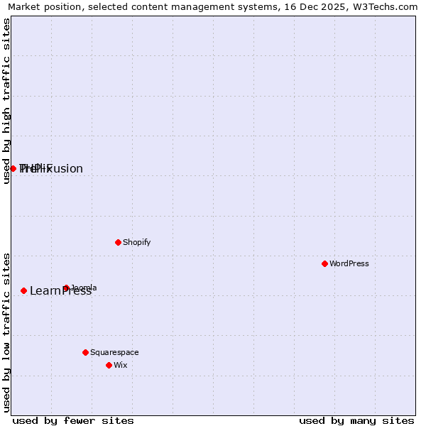 TechnologiesContent ManagementServer-side Languages Client-side Languages JavaScript Libraries CSS Frameworks Web Servers Web Panels Operating Systems Web Hosting Data Centers Reverse Proxies DNS Servers Email Servers SSL Certificate Authorities Content Delivery Traffic Analysis Tools Advertising Networks Tag Managers Social Widgets Site Elements Structured Data Markup Languages Character Encodings Image File Formats Top Level Domains Server Locations Content Languages | Technologies > Content Management > Technology usage comparison Comparison of the usage statistics of LearnPress vs. PHP-Fusion vs. Trellix for websitesThis report shows the usage statistics of LearnPress vs. PHP-Fusion vs. Trellix as content management system on the web. See technologies overview for explanations on the methodologies used in the surveys. Our reports are updated daily. Usage and market shareThis diagram shows the percentages of websites using the selected technologies. How to read the diagram: