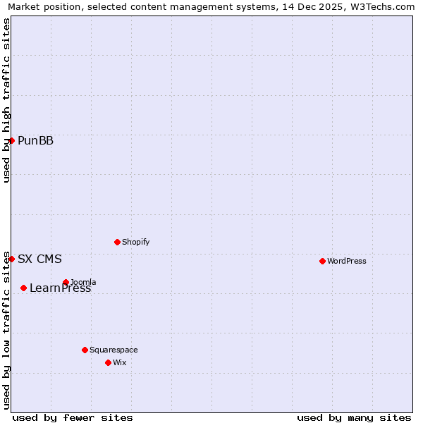 TechnologiesContent ManagementServer-side Languages Client-side Languages JavaScript Libraries CSS Frameworks Web Servers Web Panels Operating Systems Web Hosting Data Centers Reverse Proxies DNS Servers Email Servers SSL Certificate Authorities Content Delivery Traffic Analysis Tools Advertising Networks Tag Managers Social Widgets Site Elements Structured Data Markup Languages Character Encodings Image File Formats Top Level Domains Server Locations Content Languages | Technologies > Content Management > Technology usage comparison Comparison of the usage statistics of LearnPress vs. PunBB vs. SX CMS for websitesThis report shows the usage statistics of LearnPress vs. PunBB vs. SX CMS as content management system on the web. See technologies overview for explanations on the methodologies used in the surveys. Our reports are updated daily. Usage and market shareThis diagram shows the percentages of websites using the selected technologies. How to read the diagram: