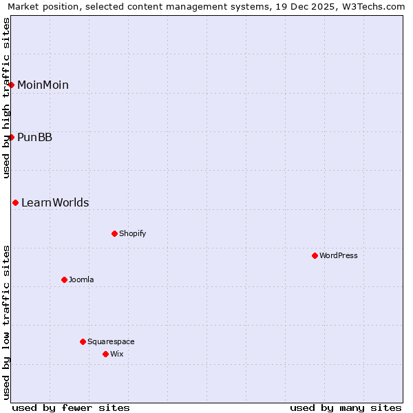 TechnologiesContent ManagementServer-side Languages Client-side Languages JavaScript Libraries CSS Frameworks Web Servers Web Panels Operating Systems Web Hosting Data Centers Reverse Proxies DNS Servers Email Servers SSL Certificate Authorities Content Delivery Traffic Analysis Tools Advertising Networks Tag Managers Social Widgets Site Elements Structured Data Markup Languages Character Encodings Image File Formats Top Level Domains Server Locations Content Languages | Technologies > Content Management > Technology usage comparison Comparison of the usage statistics of LearnWorlds vs. MoinMoin vs. PunBB for websitesThis report shows the usage statistics of LearnWorlds vs. MoinMoin vs. PunBB as content management system on the web. See technologies overview for explanations on the methodologies used in the surveys. Our reports are updated daily. Usage and market shareThis diagram shows the percentages of websites using the selected technologies. How to read the diagram: