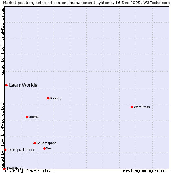 TechnologiesContent ManagementServer-side Languages Client-side Languages JavaScript Libraries CSS Frameworks Web Servers Web Panels Operating Systems Web Hosting Data Centers Reverse Proxies DNS Servers Email Servers SSL Certificate Authorities Content Delivery Traffic Analysis Tools Advertising Networks Tag Managers Social Widgets Site Elements Structured Data Markup Languages Character Encodings Image File Formats Top Level Domains Server Locations Content Languages | Technologies > Content Management > Technology usage comparison Comparison of the usage statistics of LearnWorlds vs. Textpattern vs. PHPFox for websitesThis report shows the usage statistics of LearnWorlds vs. Textpattern vs. PHPFox as content management system on the web. See technologies overview for explanations on the methodologies used in the surveys. Our reports are updated daily. Usage and market shareThis diagram shows the percentages of websites using the selected technologies. How to read the diagram: