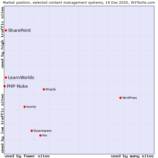 TechnologiesContent ManagementServer-side Languages Client-side Languages JavaScript Libraries CSS Frameworks Web Servers Web Panels Operating Systems Web Hosting Data Centers Reverse Proxies DNS Servers Email Servers SSL Certificate Authorities Content Delivery Traffic Analysis Tools Advertising Networks Tag Managers Social Widgets Site Elements Structured Data Markup Languages Character Encodings Image File Formats Top Level Domains Server Locations Content Languages | Technologies > Content Management > Technology usage comparison Comparison of the usage statistics of LearnWorlds vs. SharePoint vs. PHP-Nuke for websitesThis report shows the usage statistics of LearnWorlds vs. SharePoint vs. PHP-Nuke as content management system on the web. See technologies overview for explanations on the methodologies used in the surveys. Our reports are updated daily. Usage and market shareThis diagram shows the percentages of websites using the selected technologies. How to read the diagram: