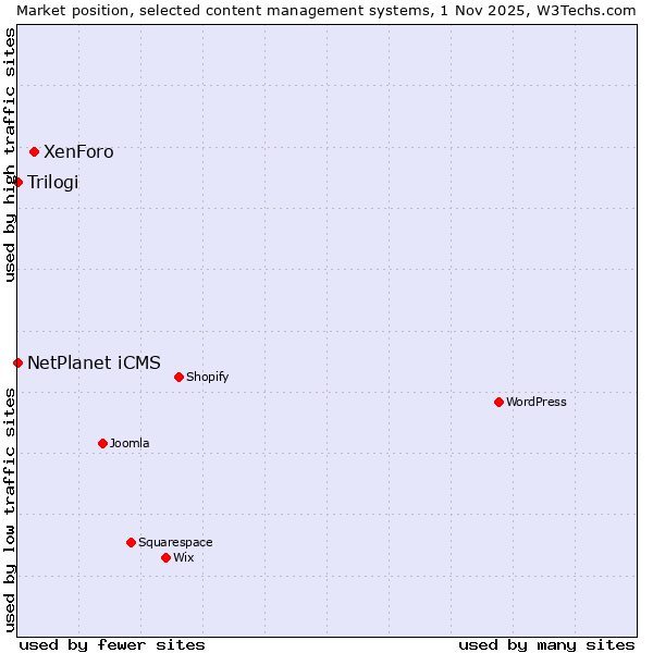 TechnologiesContent ManagementServer-side Languages Client-side Languages JavaScript Libraries CSS Frameworks Web Servers Web Panels Operating Systems Web Hosting Data Centers Reverse Proxies DNS Servers Email Servers SSL Certificate Authorities Content Delivery Traffic Analysis Tools Advertising Networks Tag Managers Social Widgets Site Elements Structured Data Markup Languages Character Encodings Image File Formats Top Level Domains Server Locations Content Languages | Technologies > Content Management > Technology usage comparison Comparison of the usage statistics of XenForo vs. NetPlanet iCMS vs. Trilogi for websitesThis report shows the usage statistics of XenForo vs. NetPlanet iCMS vs. Trilogi as content management system on the web. See technologies overview for explanations on the methodologies used in the surveys. Our reports are updated daily. Usage and market shareThis diagram shows the percentages of websites using the selected technologies. How to read the diagram: