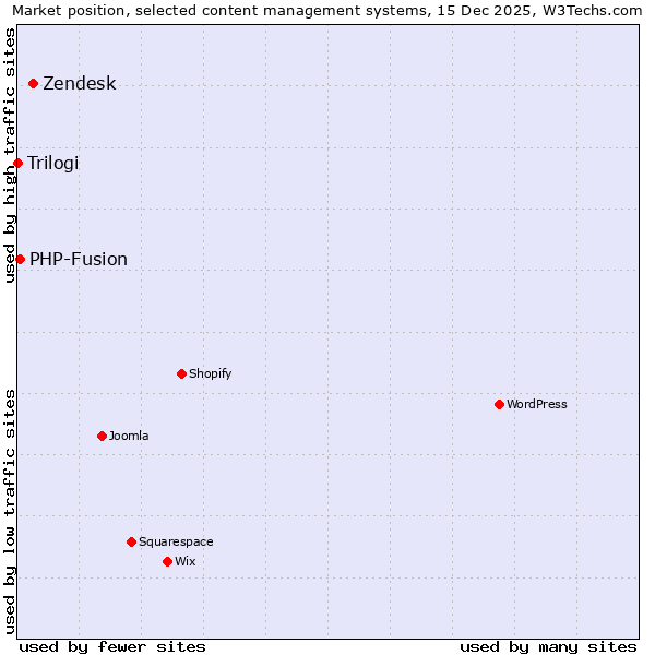 TechnologiesContent ManagementServer-side Languages Client-side Languages JavaScript Libraries CSS Frameworks Web Servers Web Panels Operating Systems Web Hosting Data Centers Reverse Proxies DNS Servers Email Servers SSL Certificate Authorities Content Delivery Traffic Analysis Tools Advertising Networks Tag Managers Social Widgets Site Elements Structured Data Markup Languages Character Encodings Image File Formats Top Level Domains Server Locations Content Languages | Technologies > Content Management > Technology usage comparison Comparison of the usage statistics of Zendesk vs. PHP-Fusion vs. Trilogi for websitesThis report shows the usage statistics of Zendesk vs. PHP-Fusion vs. Trilogi as content management system on the web. See technologies overview for explanations on the methodologies used in the surveys. Our reports are updated daily. Usage and market shareThis diagram shows the percentages of websites using the selected technologies. How to read the diagram: