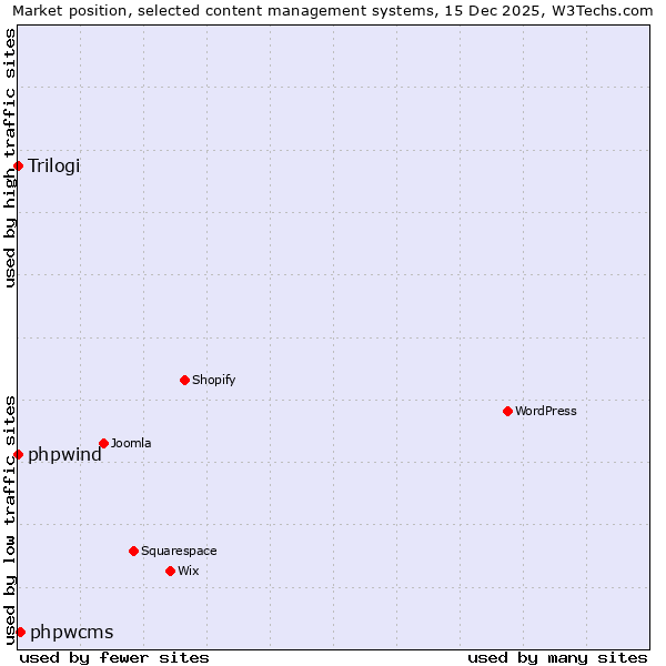 TechnologiesContent ManagementServer-side Languages Client-side Languages JavaScript Libraries CSS Frameworks Web Servers Web Panels Operating Systems Web Hosting Data Centers Reverse Proxies DNS Servers Email Servers SSL Certificate Authorities Content Delivery Traffic Analysis Tools Advertising Networks Tag Managers Social Widgets Site Elements Structured Data Markup Languages Character Encodings Image File Formats Top Level Domains Server Locations Content Languages | Technologies > Content Management > Technology usage comparison Comparison of the usage statistics of phpwcms vs. phpwind vs. Trilogi for websitesThis report shows the usage statistics of phpwcms vs. phpwind vs. Trilogi as content management system on the web. See technologies overview for explanations on the methodologies used in the surveys. Our reports are updated daily. Usage and market shareThis diagram shows the percentages of websites using the selected technologies. How to read the diagram: