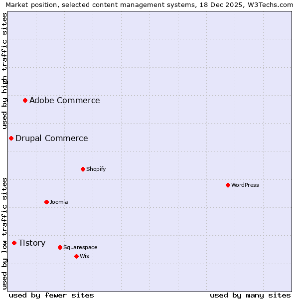 TechnologiesContent ManagementServer-side Languages Client-side Languages JavaScript Libraries CSS Frameworks Web Servers Web Panels Operating Systems Web Hosting Data Centers Reverse Proxies DNS Servers Email Servers SSL Certificate Authorities Content Delivery Traffic Analysis Tools Advertising Networks Tag Managers Social Widgets Site Elements Structured Data Markup Languages Character Encodings Image File Formats Top Level Domains Server Locations Content Languages | Technologies > Content Management > Technology usage comparison Comparison of the usage statistics of Adobe Commerce vs. Tistory vs. Drupal Commerce for websitesThis report shows the usage statistics of Adobe Commerce vs. Tistory vs. Drupal Commerce as content management system on the web. See technologies overview for explanations on the methodologies used in the surveys. Our reports are updated daily. Usage and market shareThis diagram shows the percentages of websites using the selected technologies. How to read the diagram: