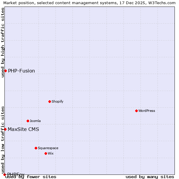 TechnologiesContent ManagementServer-side Languages Client-side Languages JavaScript Libraries CSS Frameworks Web Servers Web Panels Operating Systems Web Hosting Data Centers Reverse Proxies DNS Servers Email Servers SSL Certificate Authorities Content Delivery Traffic Analysis Tools Advertising Networks Tag Managers Social Widgets Site Elements Structured Data Markup Languages Character Encodings Image File Formats Top Level Domains Server Locations Content Languages | Technologies > Content Management > Technology usage comparison Comparison of the usage statistics of PHP-Fusion vs. MaxSite CMS vs. PHPFox for websitesThis report shows the usage statistics of PHP-Fusion vs. MaxSite CMS vs. PHPFox as content management system on the web. See technologies overview for explanations on the methodologies used in the surveys. Our reports are updated daily. Usage and market shareThis diagram shows the percentages of websites using the selected technologies. How to read the diagram: