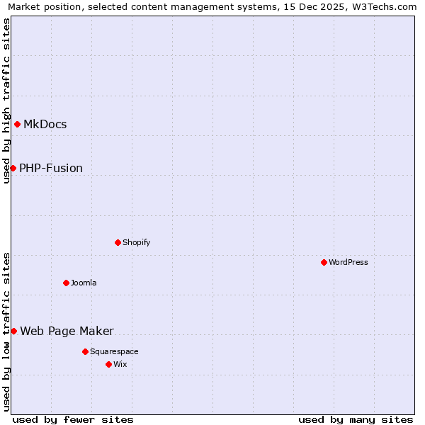 TechnologiesContent ManagementServer-side Languages Client-side Languages JavaScript Libraries CSS Frameworks Web Servers Web Panels Operating Systems Web Hosting Data Centers Reverse Proxies DNS Servers Email Servers SSL Certificate Authorities Content Delivery Traffic Analysis Tools Advertising Networks Tag Managers Social Widgets Site Elements Structured Data Markup Languages Character Encodings Image File Formats Top Level Domains Server Locations Content Languages | Technologies > Content Management > Technology usage comparison Comparison of the usage statistics of MkDocs vs. Web Page Maker vs. PHP-Fusion for websitesThis report shows the usage statistics of MkDocs vs. Web Page Maker vs. PHP-Fusion as content management system on the web. See technologies overview for explanations on the methodologies used in the surveys. Our reports are updated daily. Usage and market shareThis diagram shows the percentages of websites using the selected technologies. How to read the diagram: