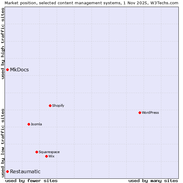 TechnologiesContent ManagementServer-side Languages Client-side Languages JavaScript Libraries CSS Frameworks Web Servers Web Panels Operating Systems Web Hosting Data Centers Reverse Proxies DNS Servers Email Servers SSL Certificate Authorities Content Delivery Traffic Analysis Tools Advertising Networks Tag Managers Social Widgets Site Elements Structured Data Markup Languages Character Encodings Image File Formats Top Level Domains Server Locations Content Languages ComparisonCompare with other | Technologies > Content Management > Technology usage comparison Comparison of the usage statistics of Restaumatic vs. MkDocs for websitesThis report shows the usage statistics of Restaumatic vs. MkDocs as content management system on the web. See technologies overview for explanations on the methodologies used in the surveys. Our reports are updated daily. Usage and market shareThis diagram shows the percentages of websites using the selected technologies. How to read the diagram: