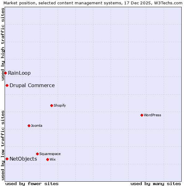 TechnologiesContent ManagementServer-side Languages Client-side Languages JavaScript Libraries CSS Frameworks Web Servers Web Panels Operating Systems Web Hosting Data Centers Reverse Proxies DNS Servers Email Servers SSL Certificate Authorities Content Delivery Traffic Analysis Tools Advertising Networks Tag Managers Social Widgets Site Elements Structured Data Markup Languages Character Encodings Image File Formats Top Level Domains Server Locations Content Languages | Technologies > Content Management > Technology usage comparison Comparison of the usage statistics of NetObjects vs. Drupal Commerce vs. RainLoop for websitesThis report shows the usage statistics of NetObjects vs. Drupal Commerce vs. RainLoop as content management system on the web. See technologies overview for explanations on the methodologies used in the surveys. Our reports are updated daily. Usage and market shareThis diagram shows the percentages of websites using the selected technologies. How to read the diagram: