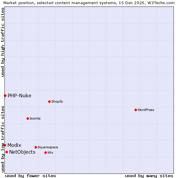 TechnologiesContent ManagementServer-side Languages Client-side Languages JavaScript Libraries CSS Frameworks Web Servers Web Panels Operating Systems Web Hosting Data Centers Reverse Proxies DNS Servers Email Servers SSL Certificate Authorities Content Delivery Traffic Analysis Tools Advertising Networks Tag Managers Social Widgets Site Elements Structured Data Markup Languages Character Encodings Image File Formats Top Level Domains Server Locations Content Languages | Technologies > Content Management > Technology usage comparison Comparison of the usage statistics of NetObjects vs. PHP-Nuke vs. Modix for websitesThis report shows the usage statistics of NetObjects vs. PHP-Nuke vs. Modix as content management system on the web. See technologies overview for explanations on the methodologies used in the surveys. Our reports are updated daily. Usage and market shareThis diagram shows the percentages of websites using the selected technologies. How to read the diagram: