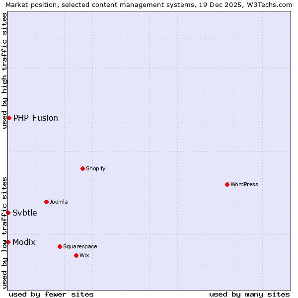 TechnologiesContent ManagementServer-side Languages Client-side Languages JavaScript Libraries CSS Frameworks Web Servers Web Panels Operating Systems Web Hosting Data Centers Reverse Proxies DNS Servers Email Servers SSL Certificate Authorities Content Delivery Traffic Analysis Tools Advertising Networks Tag Managers Social Widgets Site Elements Structured Data Markup Languages Character Encodings Image File Formats Top Level Domains Server Locations Content Languages | Technologies > Content Management > Technology usage comparison Comparison of the usage statistics of PHP-Fusion vs. Modix vs. Svbtle for websitesThis report shows the usage statistics of PHP-Fusion vs. Modix vs. Svbtle as content management system on the web. See technologies overview for explanations on the methodologies used in the surveys. Our reports are updated daily. Usage and market shareThis diagram shows the percentages of websites using the selected technologies. How to read the diagram: