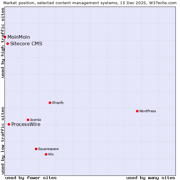 TechnologiesContent ManagementServer-side Languages Client-side Languages JavaScript Libraries CSS Frameworks Web Servers Web Panels Operating Systems Web Hosting Data Centers Reverse Proxies DNS Servers Email Servers SSL Certificate Authorities Content Delivery Traffic Analysis Tools Advertising Networks Tag Managers Social Widgets Site Elements Structured Data Markup Languages Character Encodings Image File Formats Top Level Domains Server Locations Content Languages | Technologies > Content Management > Technology usage comparison Comparison of the usage statistics of ProcessWire vs. Sitecore CMS vs. MoinMoin for websitesThis report shows the usage statistics of ProcessWire vs. Sitecore CMS vs. MoinMoin as content management system on the web. See technologies overview for explanations on the methodologies used in the surveys. Our reports are updated daily. Usage and market shareThis diagram shows the percentages of websites using the selected technologies. How to read the diagram: